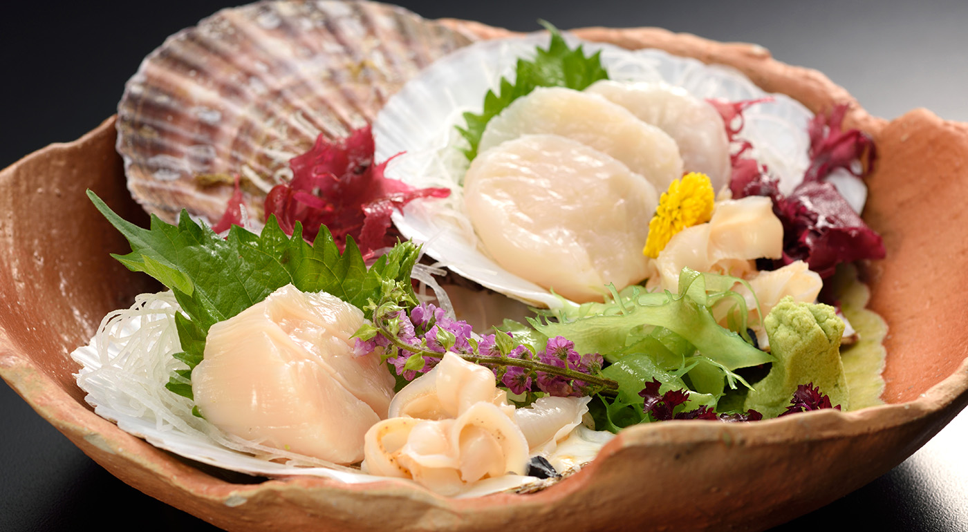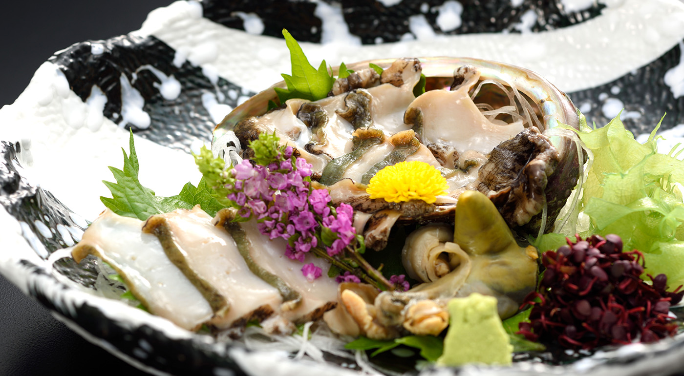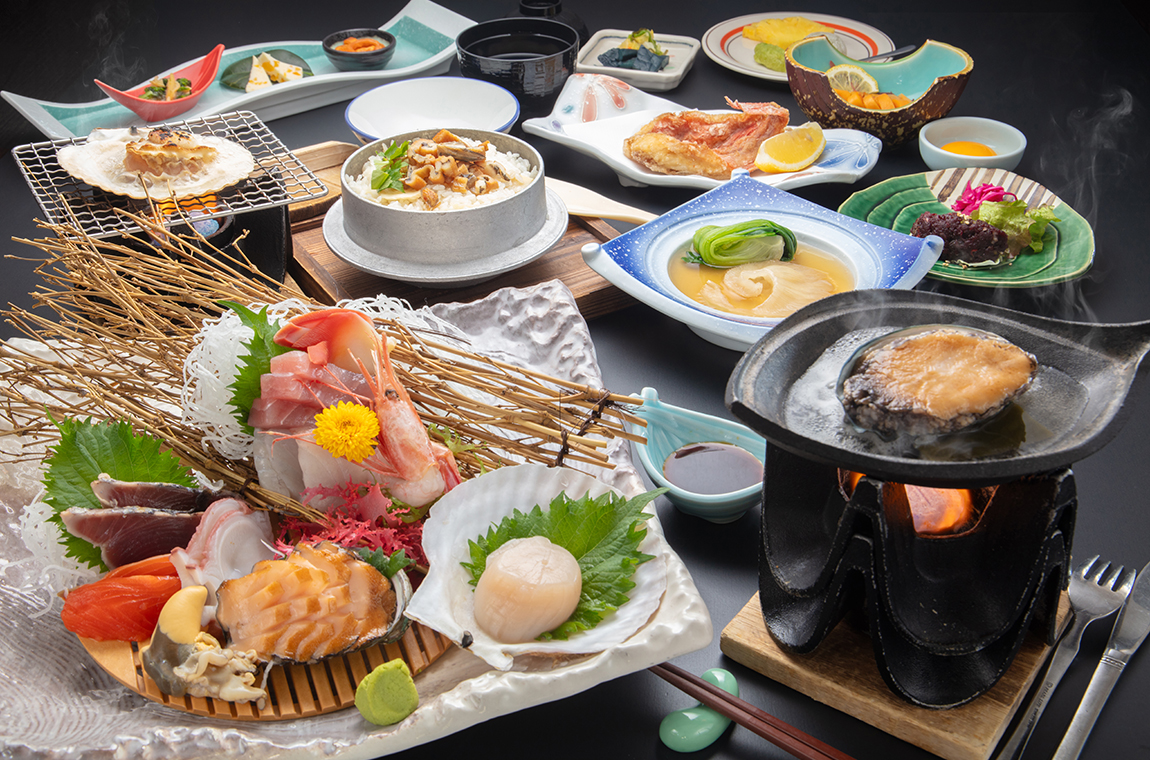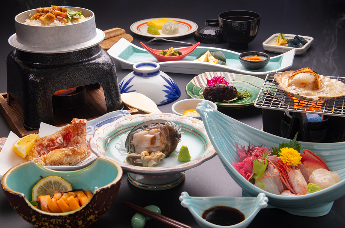 Luxuriously incorporates the delicious flavors of the Oshika peninsula, such as ,Abalone grilled in a ceramic plate,Abalone sashimi,Whale dishes,Seafood kamameshi, sashimi from the Sanriku and sweets.