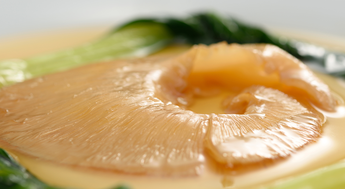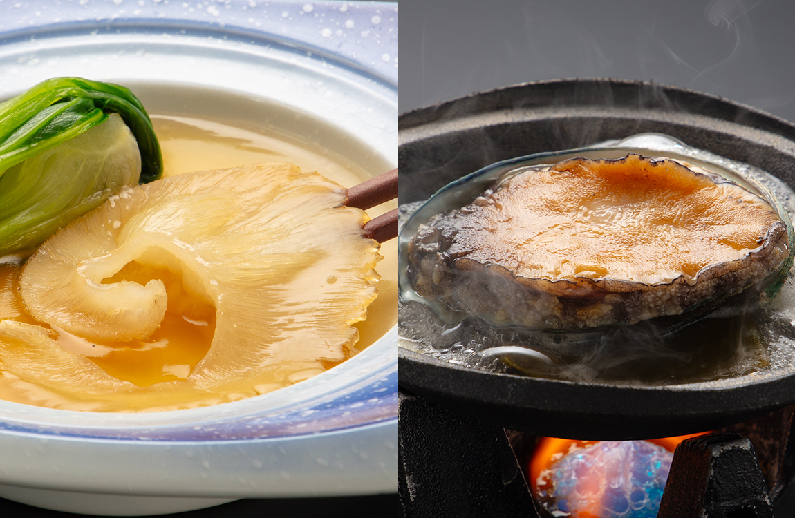 Grilled abalone on a ceramic plate and simmered shark fin set course.